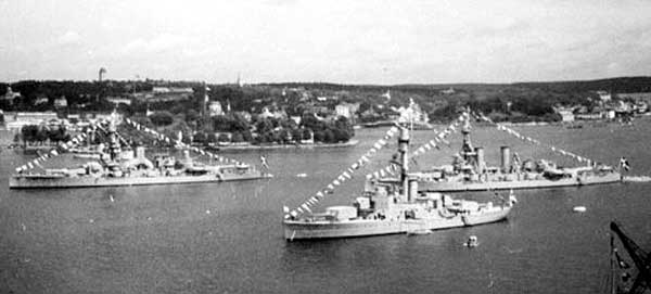 U-båtarna Illern och Uttern samt Torpedbåten 41 Spica (byggd 1908 på Bergsunds Varv) ligger vid f.d. 1:a kl. pansarbåten Svea, här ombyggd till u-båtsdepåfartyg.