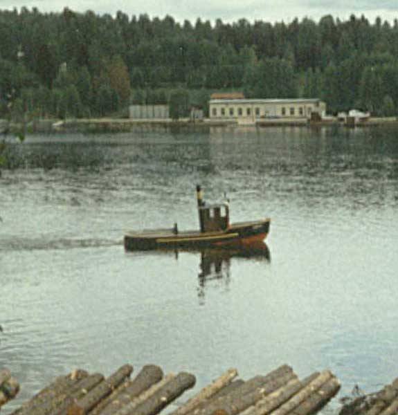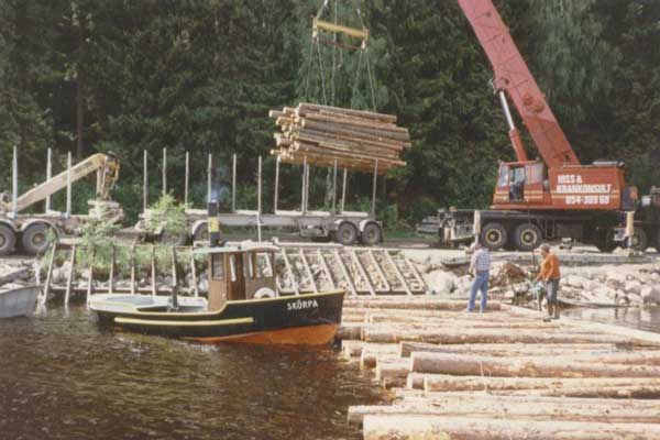 Den lilla bogserbåten Skôrpa ligger beredd att dra ut de små timmersläpen