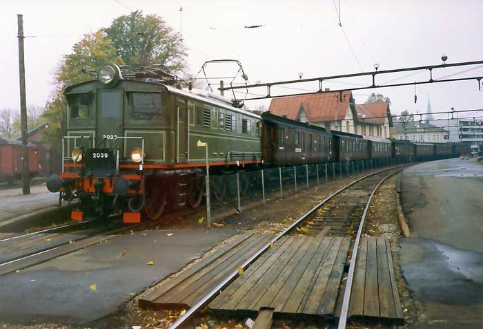 NSB El 5 2039 med trävagnar i Fredrikstad - 1986