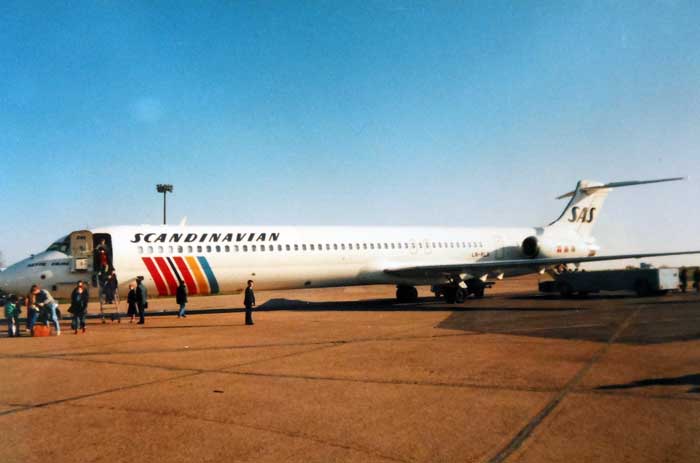 SAS DC-9 som vi flög med till England, på Stansted 7 februari 1988