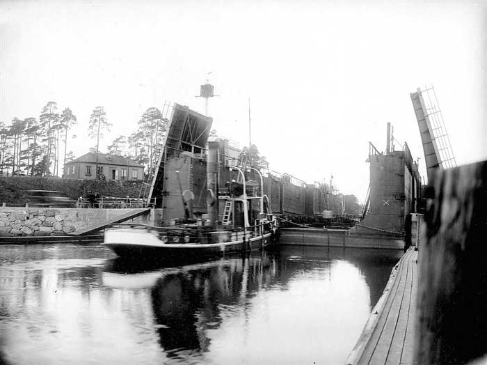 Bogserbåten FREJ (skymd) med flytdockan WULCAN på ingående i slussen söderifrån, assisteras av bogserbåten FOLKE, vilken akterifrån vid ingåendet i slussen är behjälplig vid flytdockans manövrering. 3/10 1928.