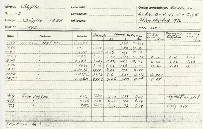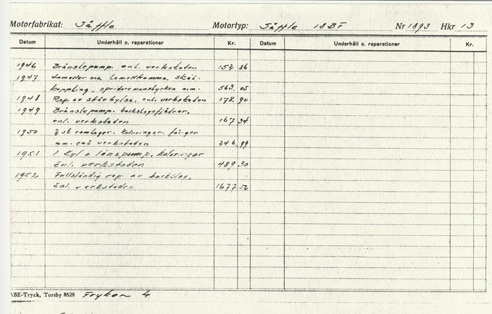 Motor: Seffle typ 18 BF på 13 hk vid 550 varv/min. Motornummer 1893 indikerar ca. 1929
