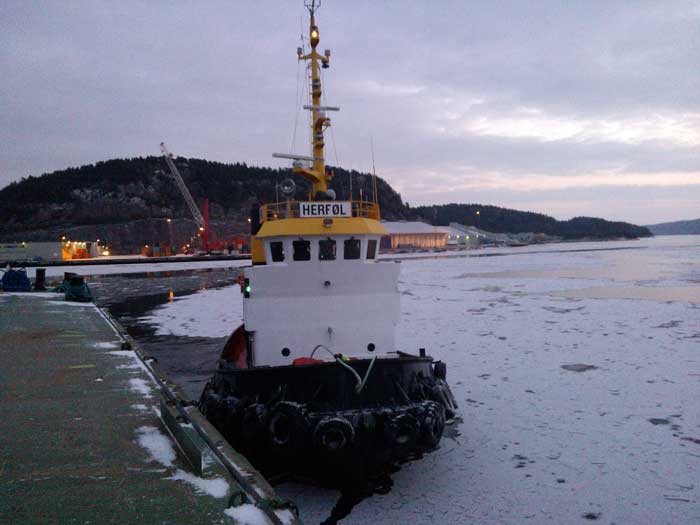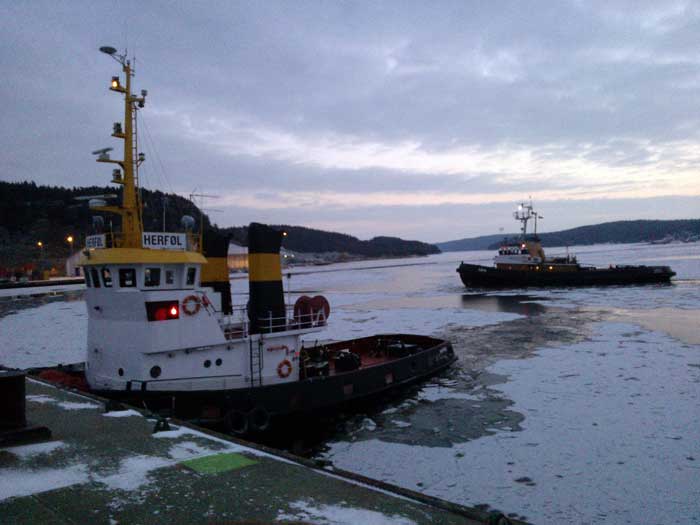 AMON med pråmen SELINA och HERFØL som bromsbåt, fotograferad från gamla Svinesundsbron, i bakgrunden syns nya bron - 14 mars 2011
