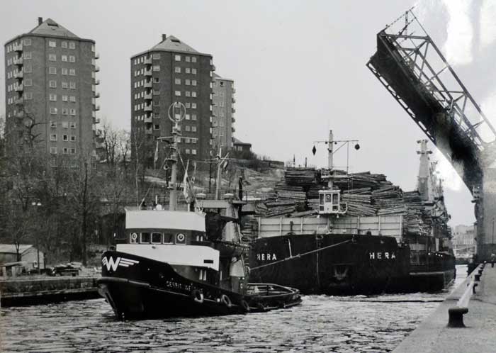 GERRIT WESSELS med Neptunbolagest pråm HERA i släp. Ekipaget har lämnat Hammarbyhamnen och passerar bron vid Danvikstull.