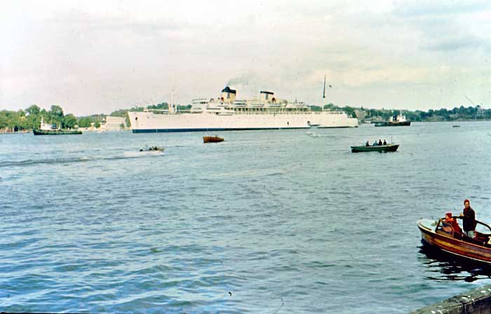 Groggbolagets Fredsgrogg och Grandgrogg förtöjer ett kryssningsfartyg på Strömmen - 1964