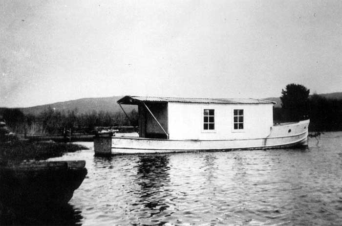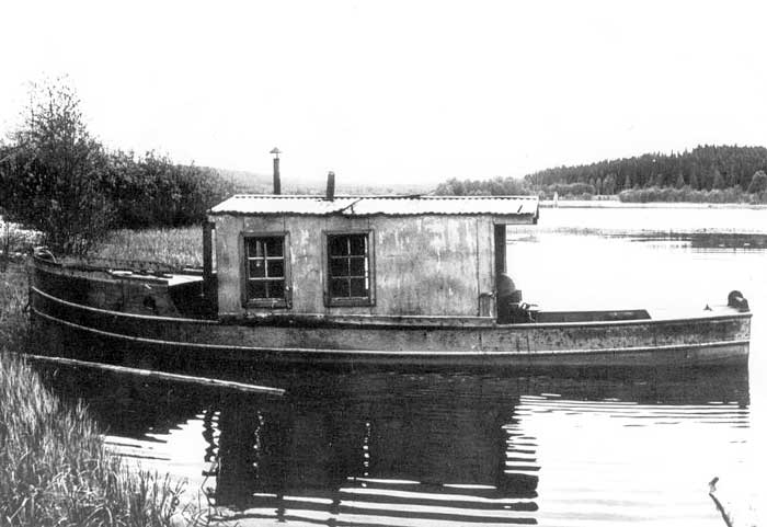 Hänsjöbåten, som av lokalbefolkningen oftast kallades ”Färja”, fick en stor överbyggnad av trä och masonit till skydd för motor och personal. Bilden torde vara tagen omkring 1950.