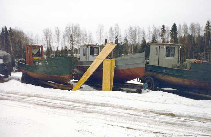 Flera Lustenbåtar upplagda på land vid Klarälvens Flottningsförenings verkstad i Dyvelsten, Forshaga, hösten 1985. Från vänster ses LUSTEN 9, LUSTEN 8, LUSTEN 10 och LUSTEN 15 .