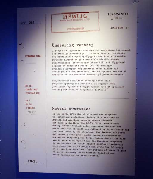 1952 sköts denna DC-3 ner av sovjetiskt jaktflyg. Flygplanet var ute på ett signalspaningsuppdrag när det sköts ner av en MIG 15.