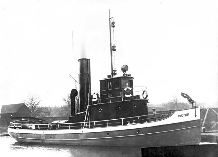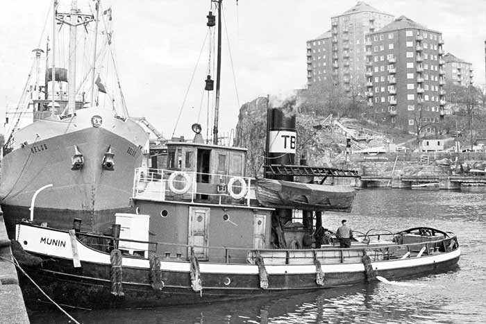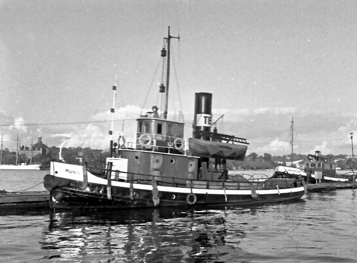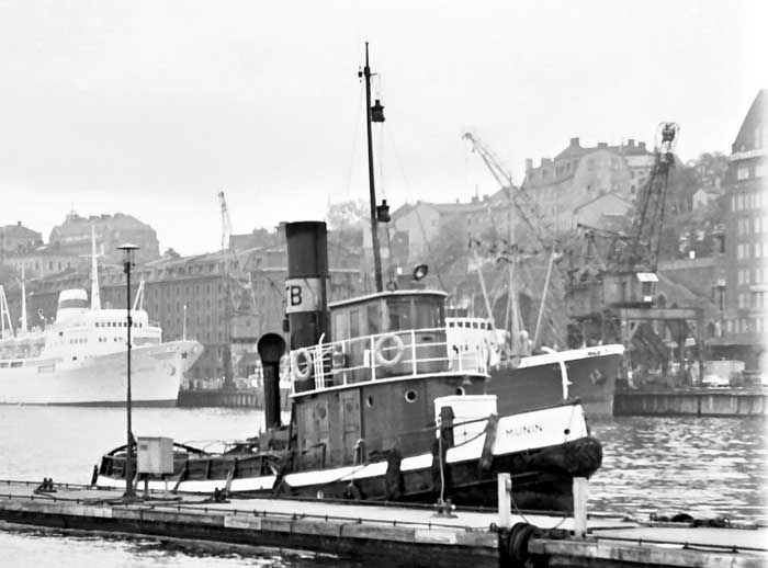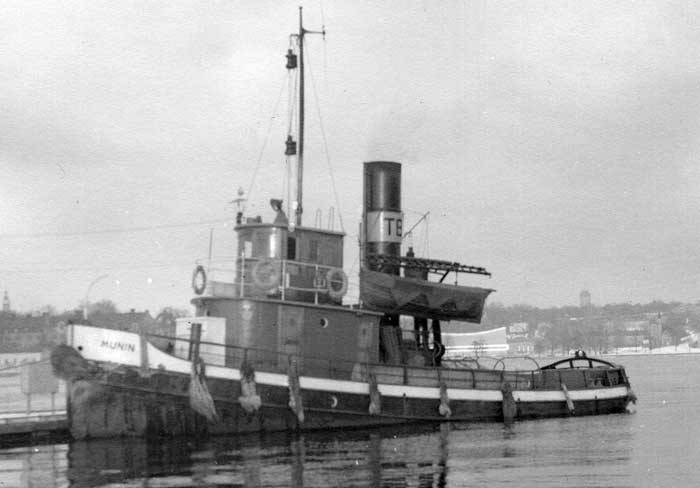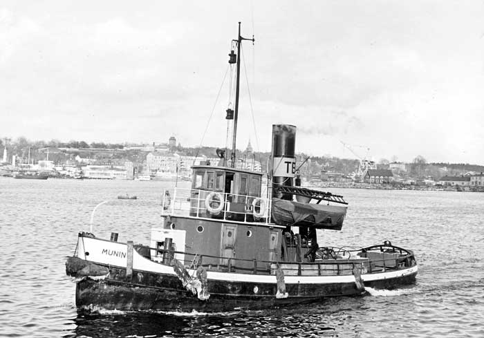Levererades den 2 nov 1918 till Stockholms Transport & Bogserings AB, Stockholm som MUNIN. T & B konkursade 1925 och övertogs av Stockholms Enskilda Bank som bildade Stockholms Nya T & B AB samma år och Stockholms Transport & Bogserings AB 1926. Utrangerades och efter nästan 50 år i rederiet lades hon upp den 9 okt 1965 i samband med en hamnarbetarkonflikt. Hon kom aldrig igång igen, utan såldes 1969 till Sture Källman, Johanneshov som skrotade. Var syster till HUGIN.