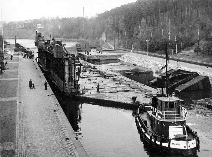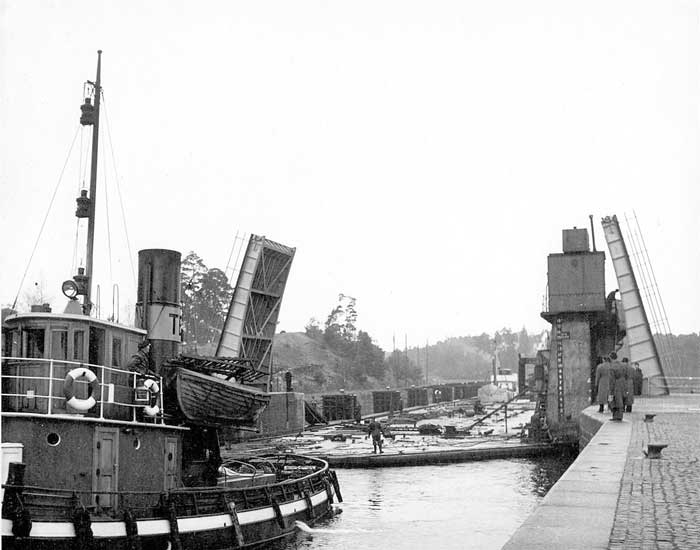 Ekensbergs flytdocka, ena delen, passerar slussbron, bogserad av bogserbåtarna HUGIN och MUNIN. 7/11 1946.