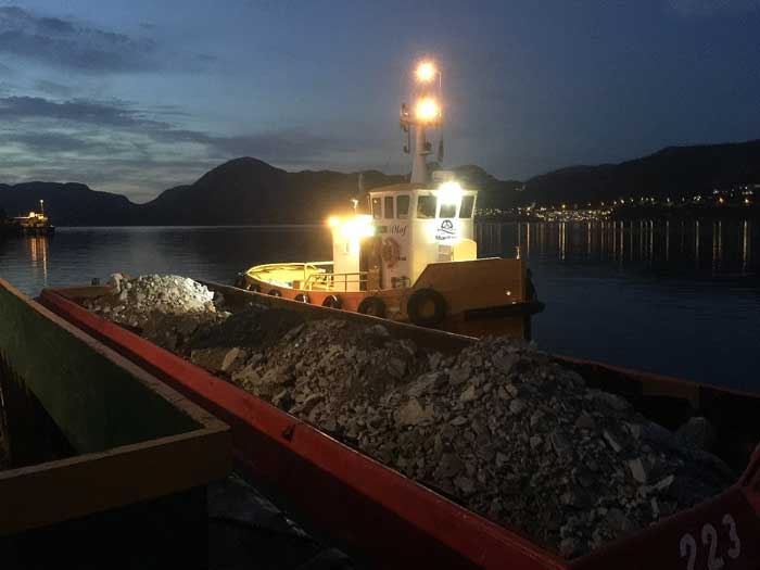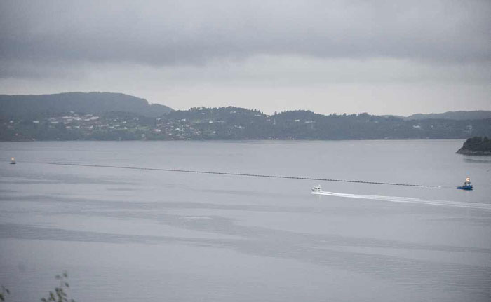 Röret bogserades från Fitjar till fiskeanläggningen Sjøtroll Havbruk på Fotlandsvåg, Osterøy.