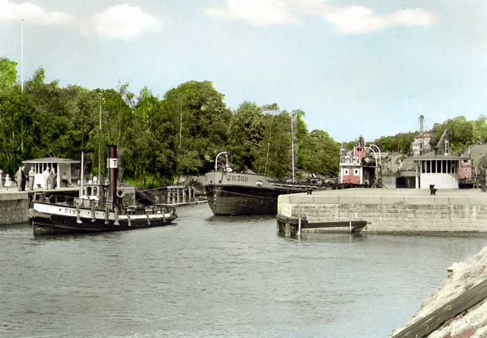 Ran och pråmen TB 368 Egil närmast, passerar genom Södertälje sluss