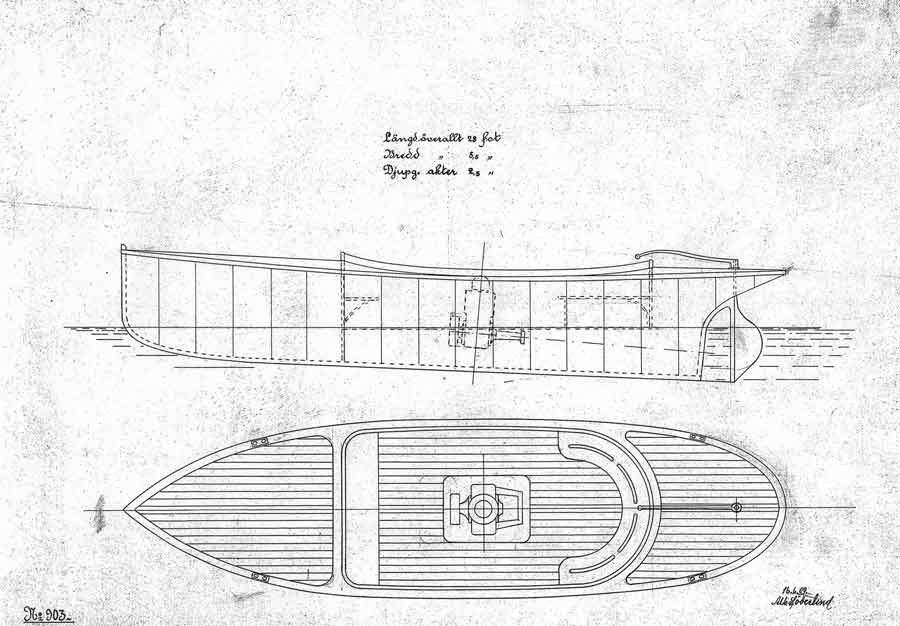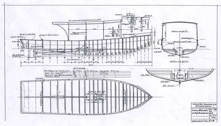 Ritningar på båtar tillverkade på Jerfeds Mek Verkstads AB i Örnsköldsvik.