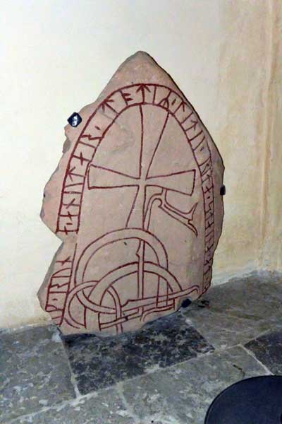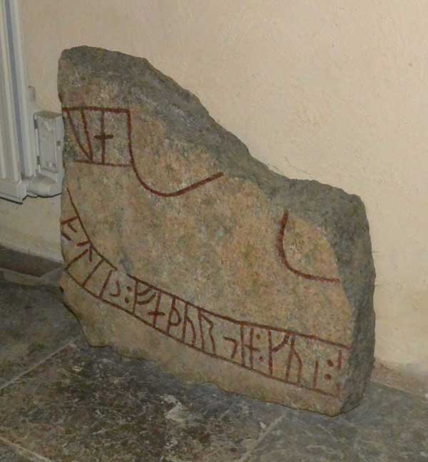 På 1700-talet fann Peringsköld även den nedre delen av stenen, så texten kan återges. Står inne i vapenhuset.