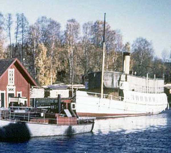 Selma Lagerlöf vinterupplagd i Torsby hamn troligen 1948. Hon har har fått ny skorstensfärg, nu ägd av Trafikaktiebolaget Frykensjöarne.