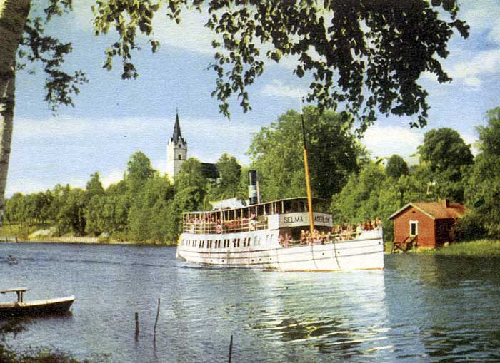 Selma Lagerlöf på utgående, nedströms i Röjdälven. Den långa rödmålade byggnaden i bakgrunden är ”Torsby Faktori” som var styckegodsmagasin samt post- och hamnkontor i Torsby. Bilden är förvisso tagen i tidsspannet 1945 – 1955 men sannolikt i början av 1950-talet. Mellandäckshusets främre skott hade tidigare varit brunbetsat men målades i nämnda tidsskede, som bilden visar, med ljus och täckande oljefärg.