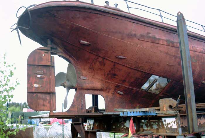 Först låg den i en pråm i Tingstads Hamn i Göteborg, sedan lyftes den iland på Arendalsvarvet och flyttades