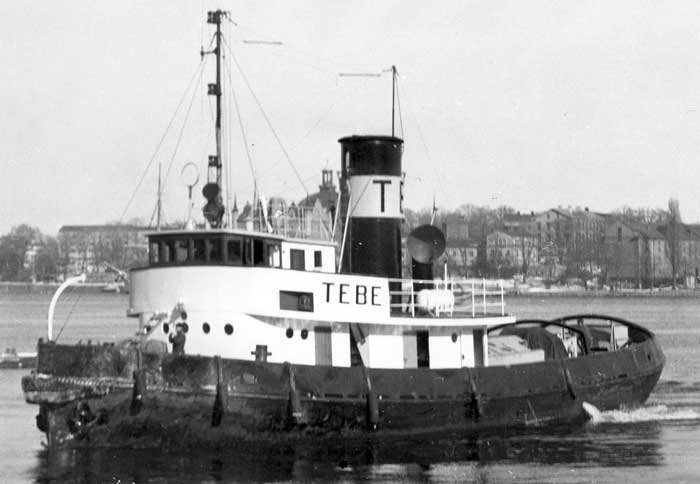 Byggdes för Stockholms Transport & Bogserings AB, Stockholm som TEBE. Såldes för 529.074 kr den 8 feb 1963 till Socitét Tunisienne do Remorquage D´Assistance & De Travaux Maritimes, Sfax, Tunisien och döptes då om till ATLAS. Köptes 1979 av Socitét d´Arm. et do Construction Navales SACNA, Tunis. Skrotades 1980.