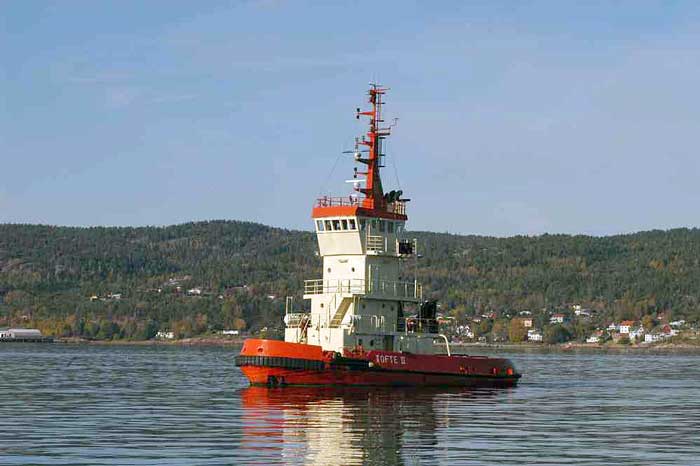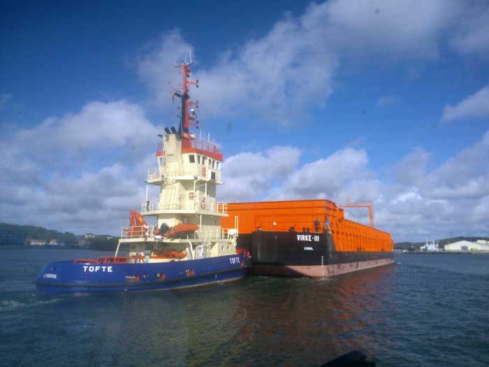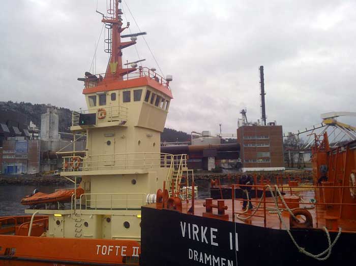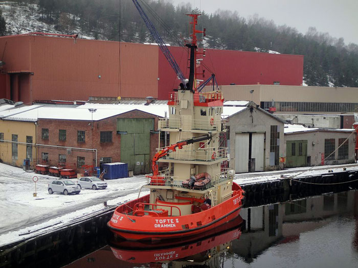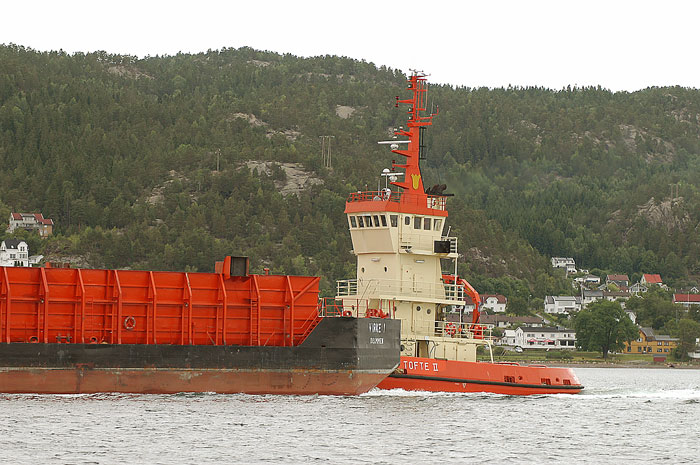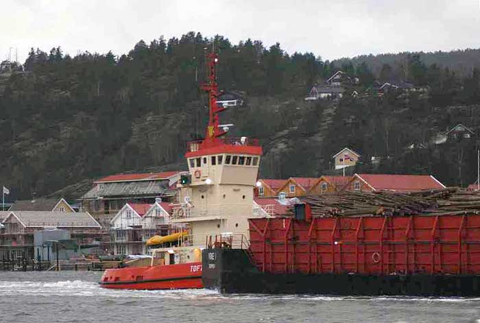 TOFTE II med pråmen VIRKE I på Svelvikstrømmen