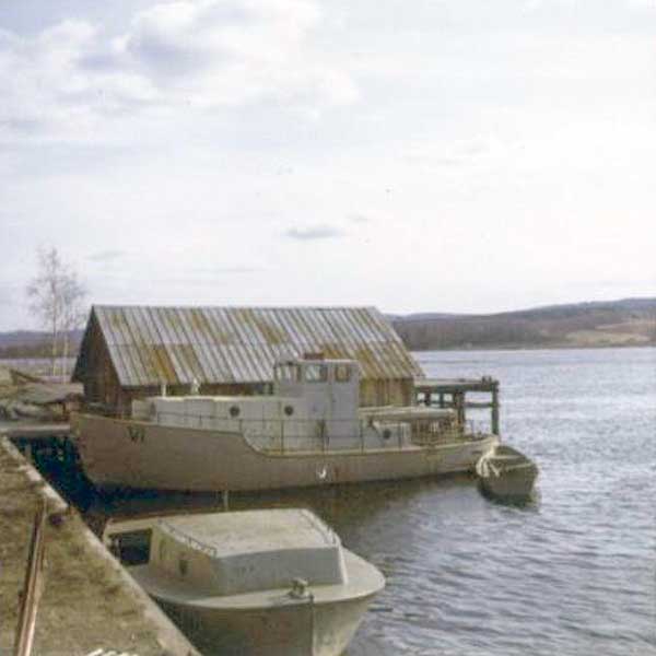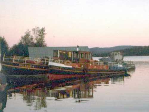 Trängslet VI har nyligen lagt till sin nya hemmahamn, Gråbobryggan i Oleby, för att målas om och utrustas. I förgrunden ligger Fryken IV som senare blev grönmålad och benämnd Björnidet. April 1971