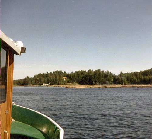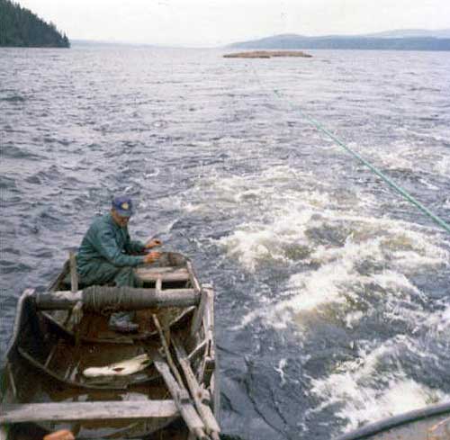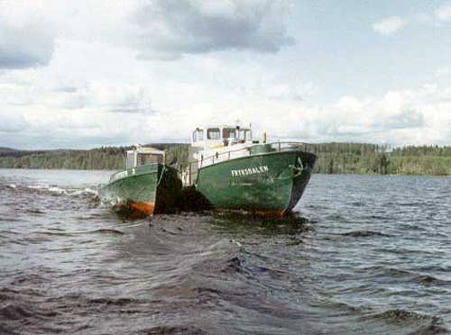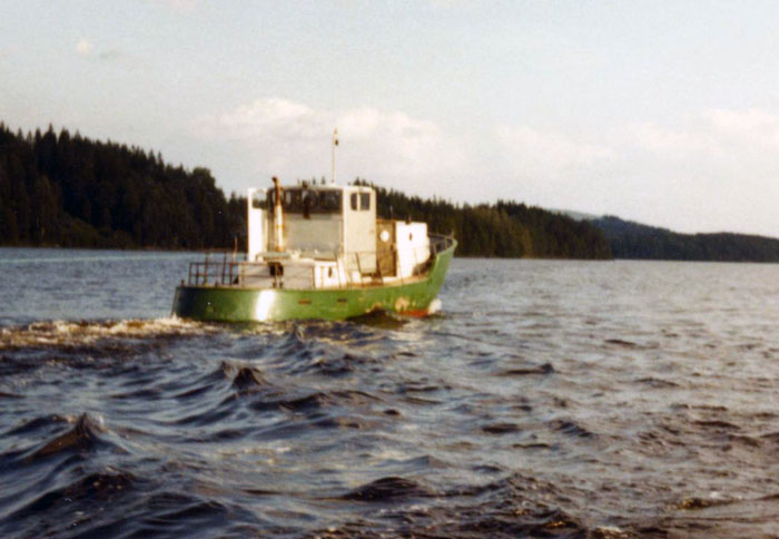 På sommaren 1974 fick jag (Håkan Larsson) följa med på en bogsering från Oleby med destination Frykfors. Fryksdalen bogserade i par med Billerud i öppen sjö men bogserbåtarna gick var för sig genom det trånga Sunnesundet. Som traditionen bjöd hade besättningen fiskedrag ute, även om detta periodvis var en förbjuden sport. Här, vid passage av Bjälverud i Övre Fryken, har Nisse, skepparen på Fryksdalen, fått en fin gädda på sitt drag.