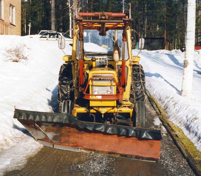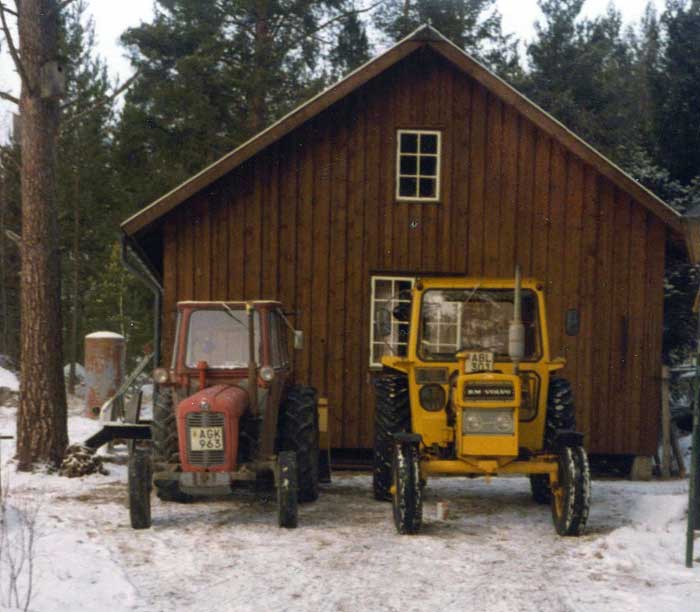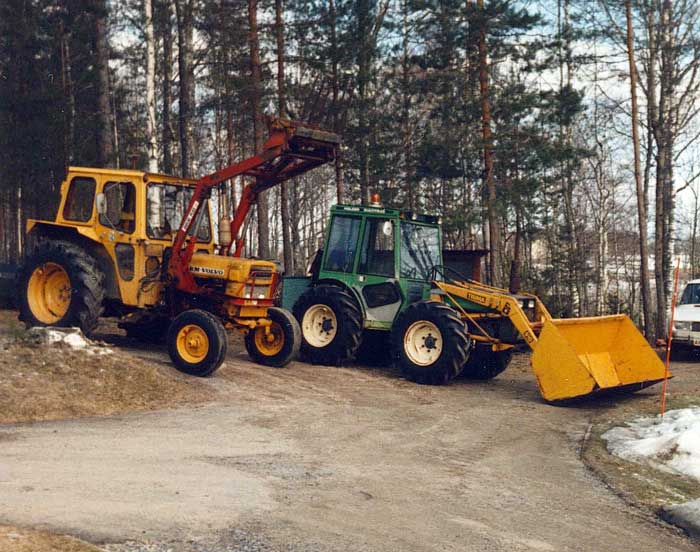 Familjens BM-Volvo användes under 1980-talets vintrar huvudsakligen för snöplogning. Vid den här tiden hade vi en hel del sådana åtaganden, dels inom privata fastigheter, men vi ansvarade också för vinterväghållningen på ett par enskilda vägar. Nu hade vi på allvar diskuterat frågan om inköp av en fyrhjulsdriven traktor. Här ses den väl använda traktorn med påmonterad diagonalplog, efter säsongens sista plogningsuppdrag i mars 1987, och snart har den tjänat ut hos oss.