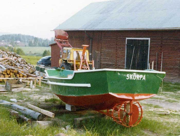 Den nyförvärvade, före detta motorvarpbåten, ställdes i ordning och målades upp under våren 1981, och i juni var den klar för sjösättning under sitt nya namn ”Skôrpa”. Traktorn, som snart skulle föra ekipaget till sjösättningsplatsen, har här ett timmerspel monterat i lyftarmarna. Detta spel, av typ FMV 20, presterade 2 tons dragkraft.