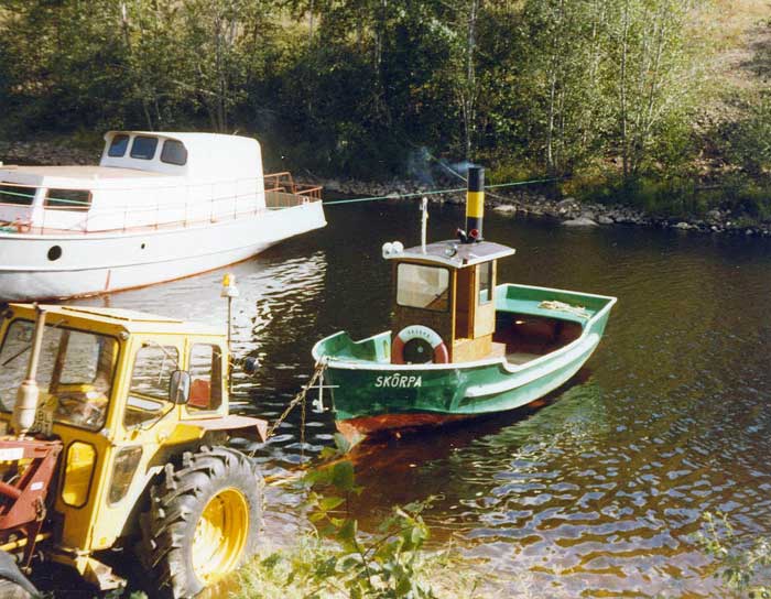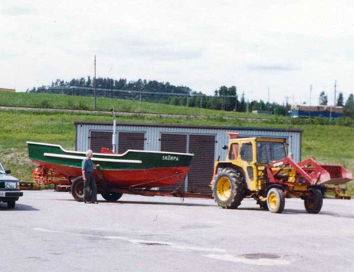 Skôrpa, som begåvats med styrhytt och skorstensattrapp på våren 1982, skulle tas upp ur sjön redan i augusti detta år. Efter det försmädliga transportmissödet som skedde ett år tidigare, hade vi nu byggt en egen båttrailer, som på alla sätt var anpassad just för Skôrpa och vår traktor. Vid detta tillfälle valde vi att tacka ja till en båtägande god vän, som erbjöd oss att få använda hans slip när vi skulle ta upp Skôrpa. Traktorn och trailern backades ut, gränsle över sliprälsen, varefter Skôrpa kördes upp på trailern.