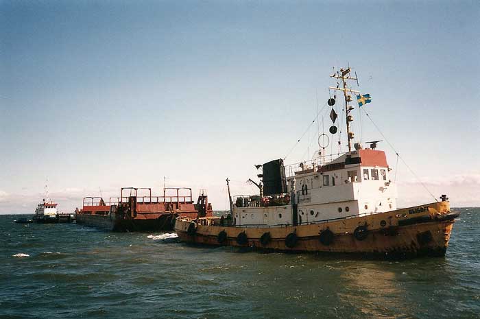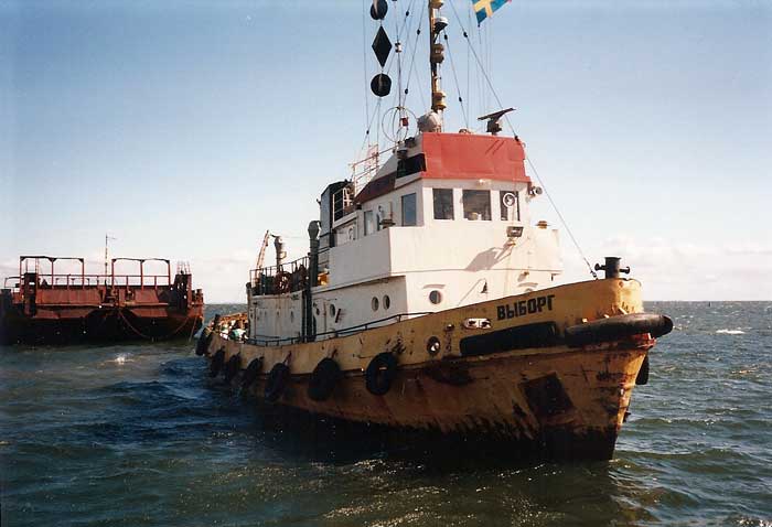 VYBORG med pråm lämnar Bergkvara våren 2001 efter att ha lossat sågtimmer