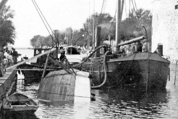 Bogserbåten är trol. Röda Bolagets Adolf byggd 1900 på Lundby. Bärgningsfartyget ser ut att vara märkt med 1844. Anders tror att det hela utspelar sig i spannet 1905 - 1930, baserat på Sjötorpsbyggena i bakgrunden.