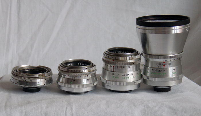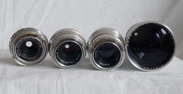 Från vänster: 35mm/f4 Color-Ambion, 50mm/f2,8 Color-Solinar, 90mm/f4 Color-Telinear samt 130mm/f4 Color-Telinear