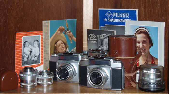På kameran sitter 35 mm objektivet. Till vänster 90 mm och till höger 50 mm. Bakom 50 mm-objektivet är ytterligare en 50 mm i den originalförpackning som alla objektiv levererades i. På den här kameran finns inga remöglor. De som finns på kameran överst på sidan har monterats i efterhand.