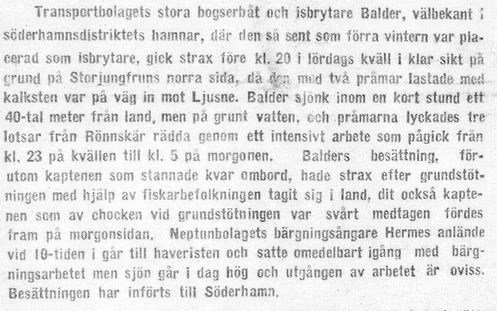 Byggdes för Stockholms Transport & Bogserings AB, Stockholm som BALDER. T&B gick i konkurs 1924 och den 11 juli detta år meddelades att tillgångarna övertagits av Stockholms Ensk. Bank, Stockholm. Den 10 okt samma år bildades Stockholms Nya T & B AB, Stockholm vilket ändrades enl ett meddelande av den 28 okt 1926 till ett nytt Stockholms T & B AB, Stockholm. Rekvirerades 1941 av Ostkustens Marinkommando, Stockholm och bestyckad bl a med en 8 mm Lv-ksp M/14-29. Fick beteckningen HJVB 82. Var tillbaka hos T&B igen 1944, men den 15 nov 1947, på resa Gotland-Norrlandskusten med två kalkstenspråmar, gick hon på grund vid Storjungfrun ca 45 m från land, där hon kantrade och delvis sjönk. Besättningen räddades. Bärgades och skrotades 1948.