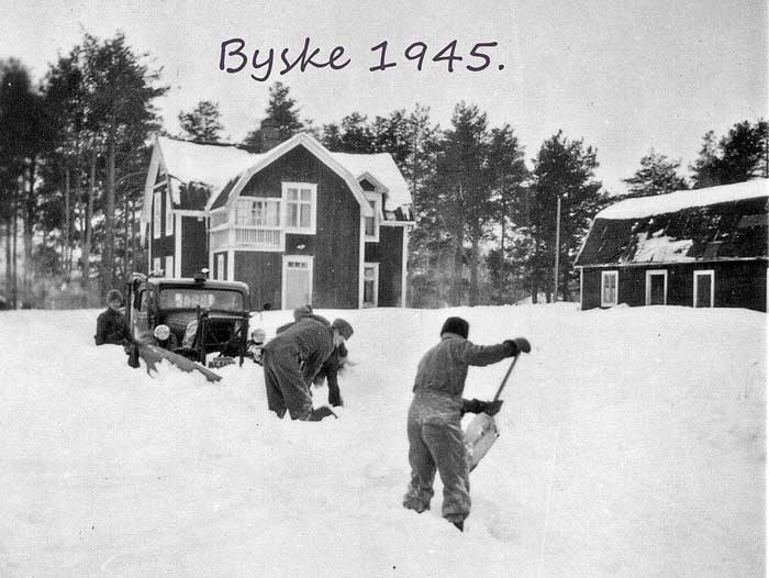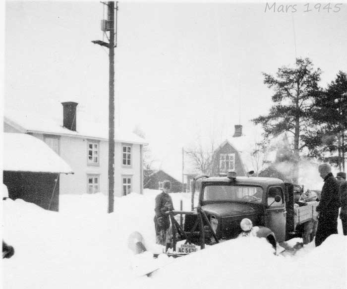 Kyrkgatan i Byske 1945. Plogbilen behöver lite hjälp.