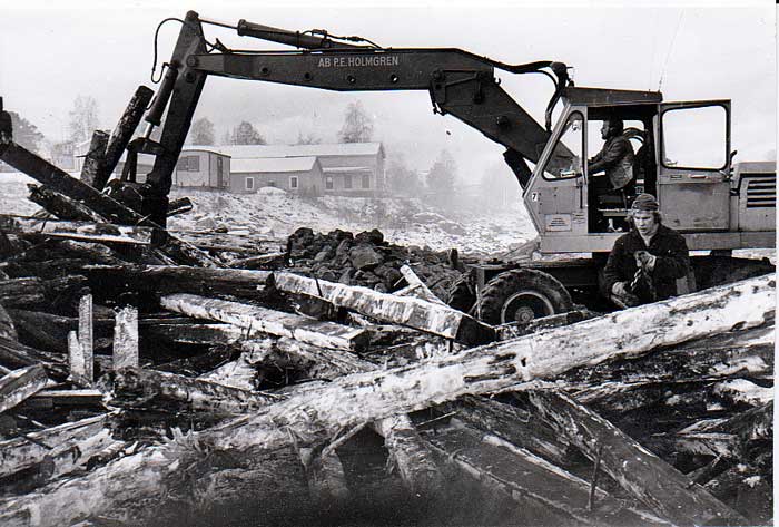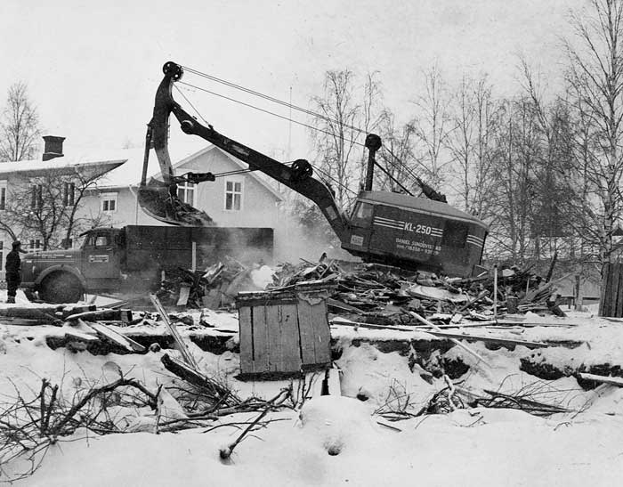 Rivning av apoteket 1973 (Kockum-Landsverk KL-250 grävmaskin och en Volvolastbil)