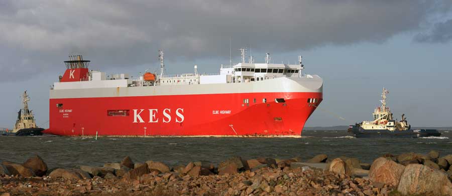 SVITZER BJØRN och SVITZER MARS hjälper K-Lines ELBE HIGHWAY till kaj i Malmö p g a hård blåst - 4 januari 2015