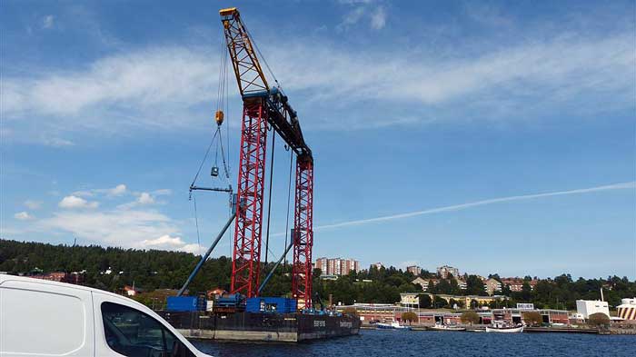 Pontonkranen som skall lyfta brosegmentet på plats
