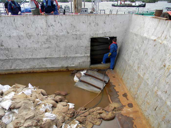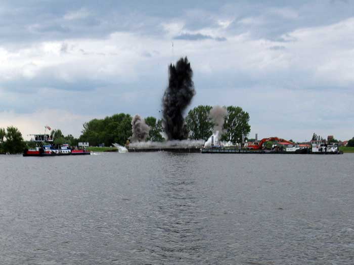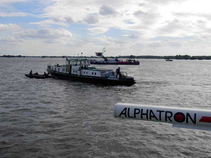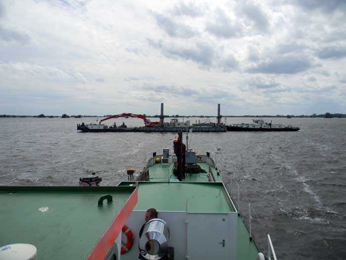 Båtar och pråmar från Wasser- und Schifffahrtsamt Magdeburg arbetar med fördämningar mot översvämningarna vid Fischbeck - 16 juni 2013