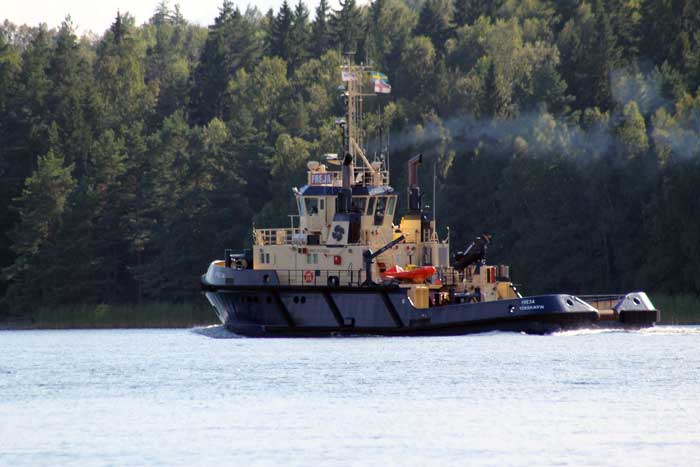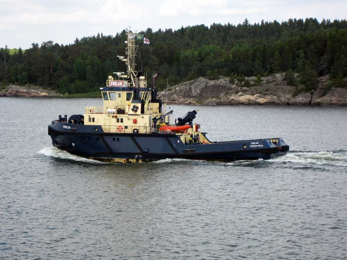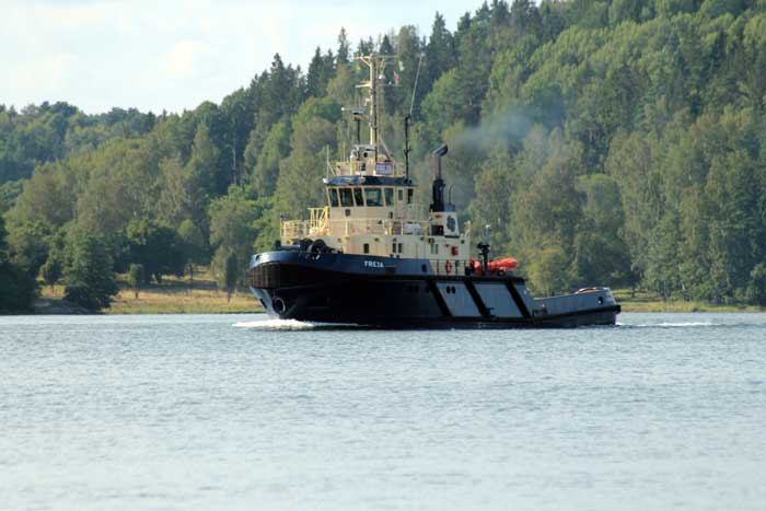 FREJA lämnar Södertälje Sydhamn och stävar hemåt, mot Oxelösund (Södertälje har ingen kraftfull bogserbåt)