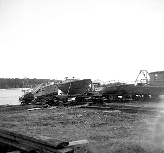 Båtar på pråmslipen i Furuögrund. Taket på Mareografen syns i mitten. Tidigt 1950-tal.
