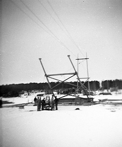 Resning av nya linbanestolpar i Sandgrensviken - 1950 talet