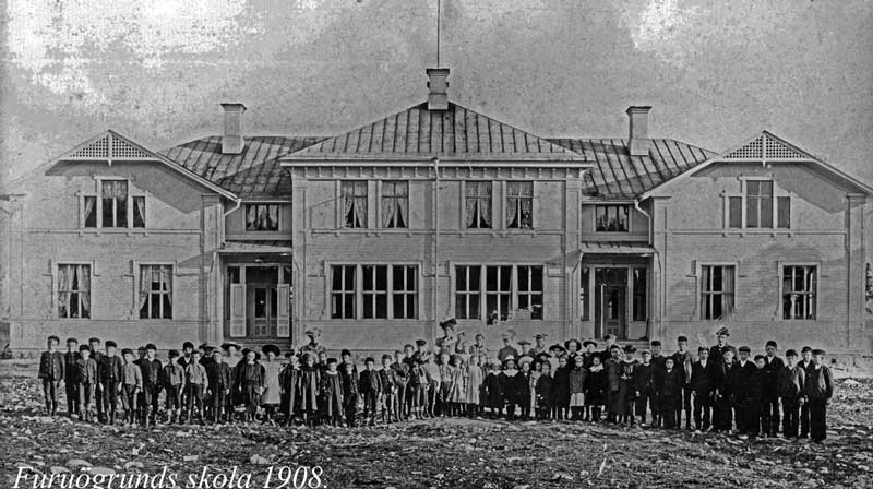 Furuögrunds skola (sedd från framsidan) med elever - 1908