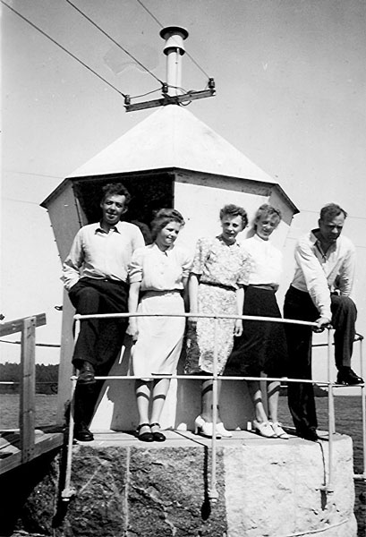 Fotograferade vid fyren Pite Rönnskär är fr.v. Torsten Bergmark, okänd, fru Bäckman, okänd, Inez Lundström, okänd, okänd samt föreståndare Bäckman