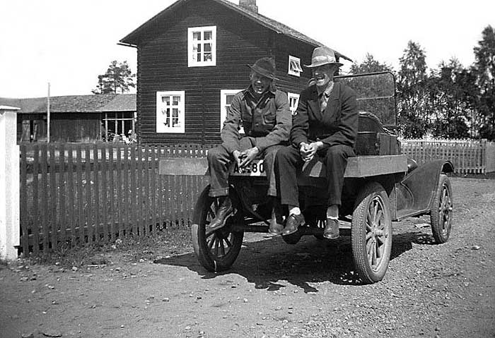 Alvar Dahlgren och Valdemar Sandberg på flaket till en lätt lastbil. I bakgrunden gamla busstationshuset vid Storgatan i Byske.