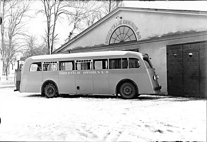 Linjebuss från Södertälje Omnibus AB. Uppställd utanför Bussgaraget vid Järnagatan - 1937.
