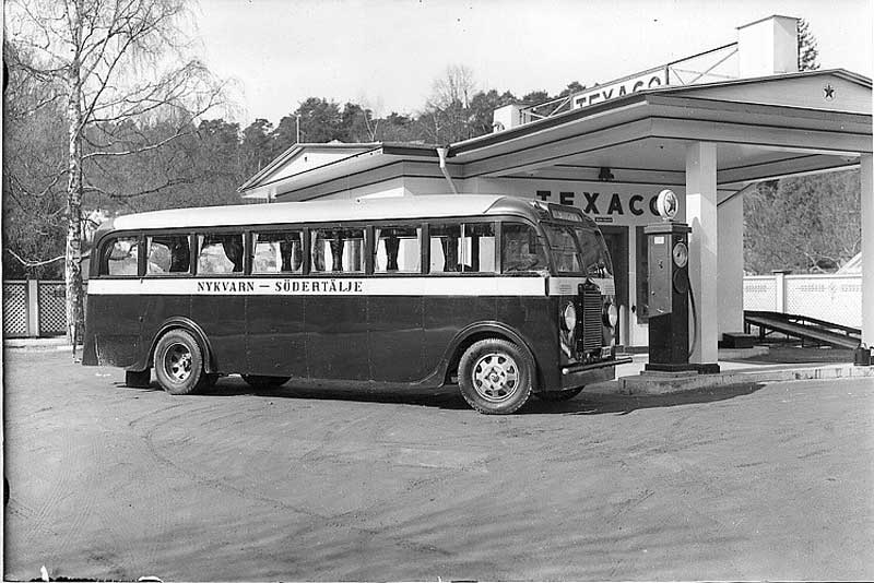 Linjebuss mellan Nykvarn och Södertälje, framför Texacomacken på Järnagatan (där Stadshuset ligger nu) - 1936.