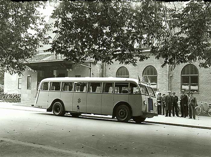 SJ-buss utanför Centralstationen i Södertälje. Bussen gick via Bergaholm till Stockholm. - 1930-40-talet.