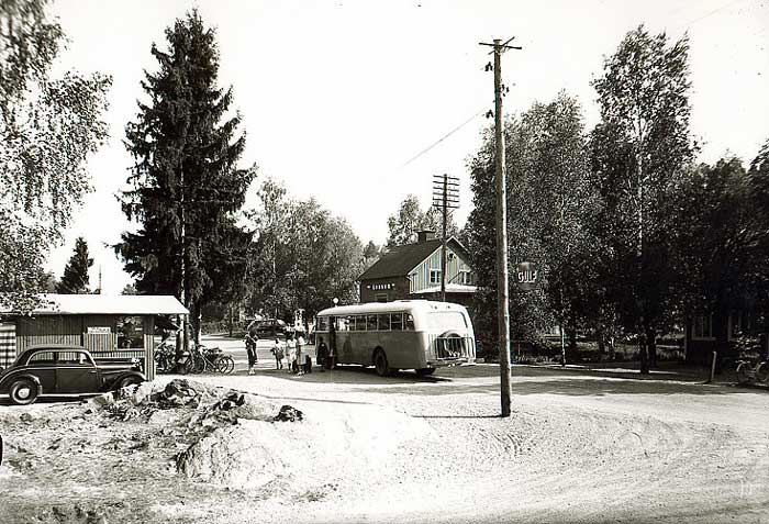Bakom bussen är Konsumaffären. Till vänster låg en Gulf bensinstation.