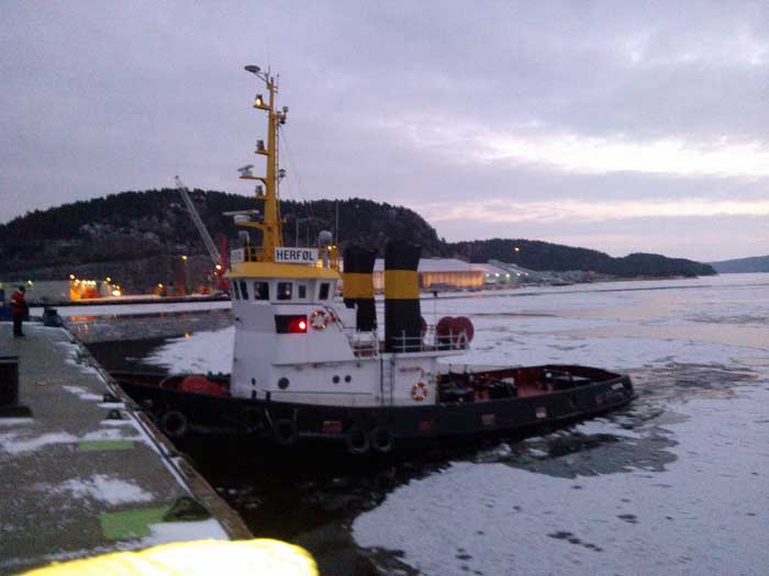 AMON med pråmen SELINA och HERFØL som bromsbåt, fotograferad från gamla Svinesundsbron, i bakgrunden syns nya bron - 14 mars 2011