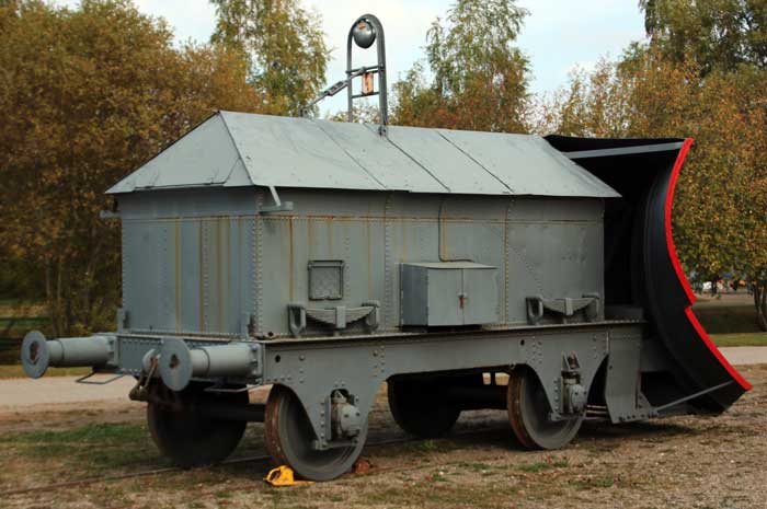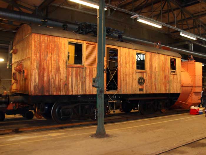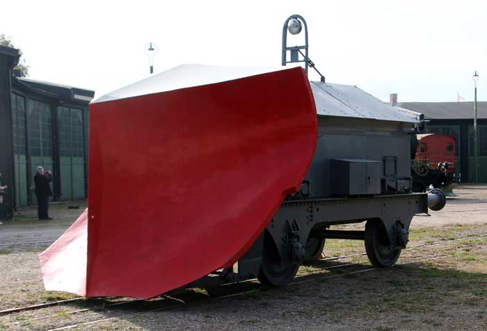 Tenderplog, 1925 ombyggd från en loktender till snöplog. Plogen lastades med sten och skrot för att bli tung. Den sköts framför ett eller flera ånglok. Användes ända in på 1980-talet.